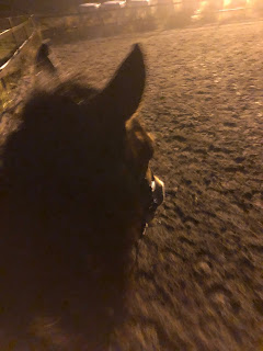 Maneesittomuuden realiteetitkin alkavat astua kuvaan - on pimeää, välillä sataa ja kenttä on märkä. Kentällä on toki valot, ja muutamana iltana on pitänyt laittaa nekin jo päälle. Nyt kun kelloja siirrettiin niin näin päivätyöläiselle arki-illan ratsastus tarkoittaa pitkälti kentän valoissa pyörimistä. Viikonloppuisin pitää sitten maastoilla ja jos/kun kenttä jäätyy, käydä maneesillakin esim. kerran viikkoon.